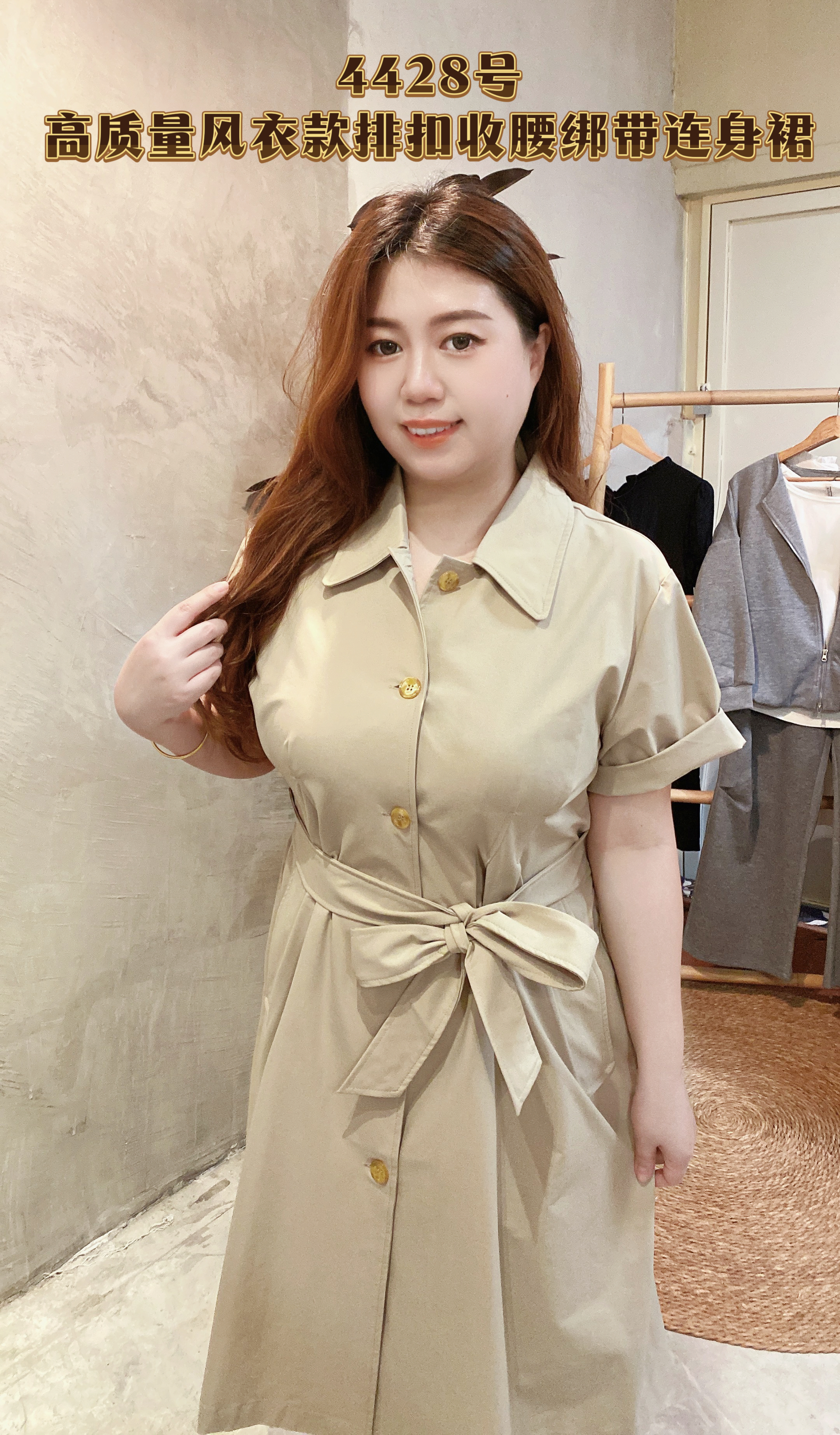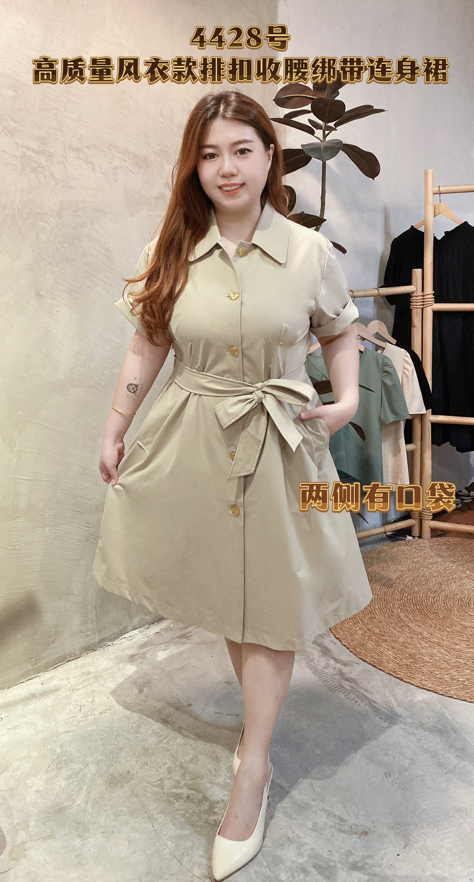 🎀4428号-高质量风衣款排扣收腰绑带连身裙