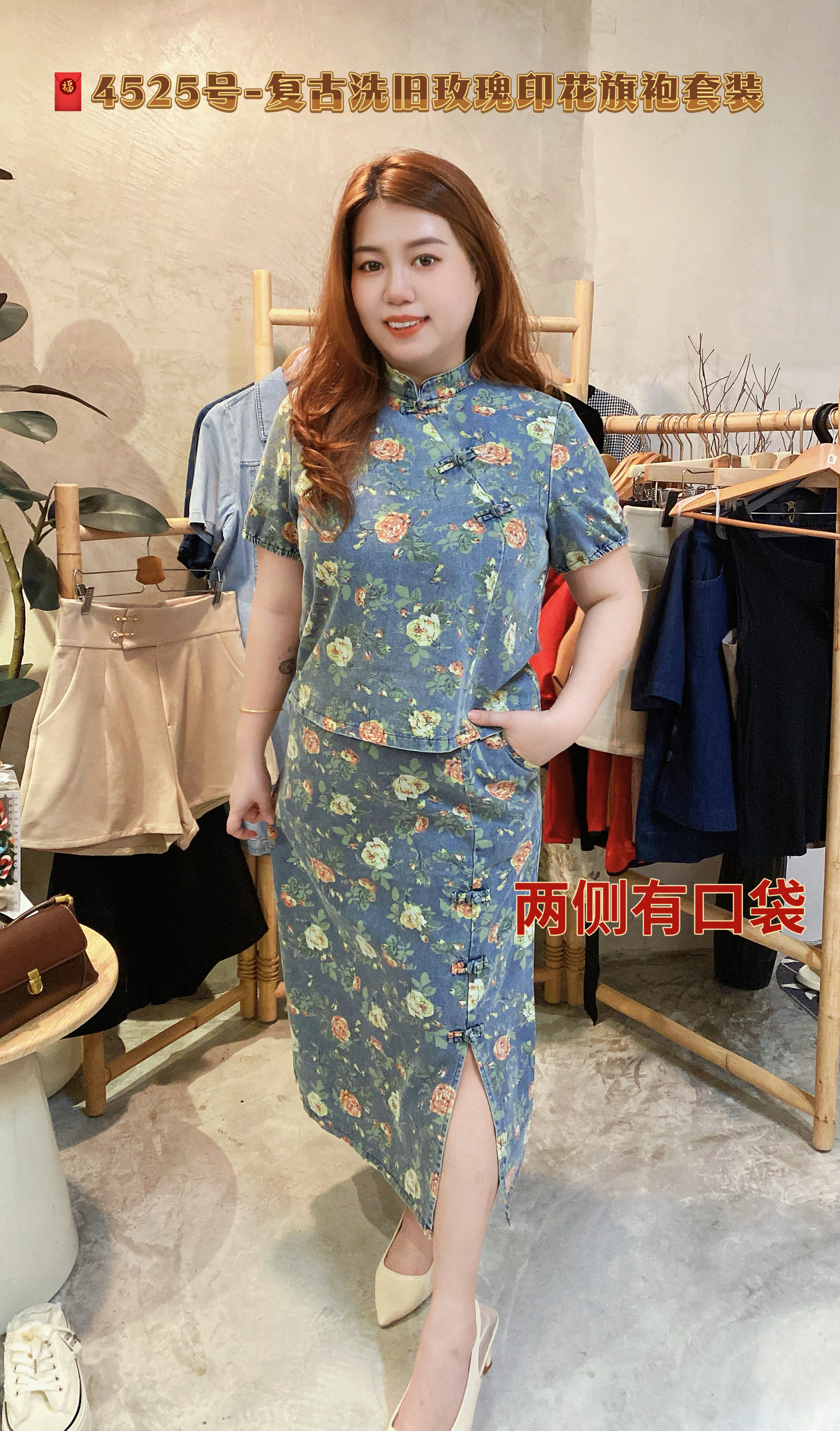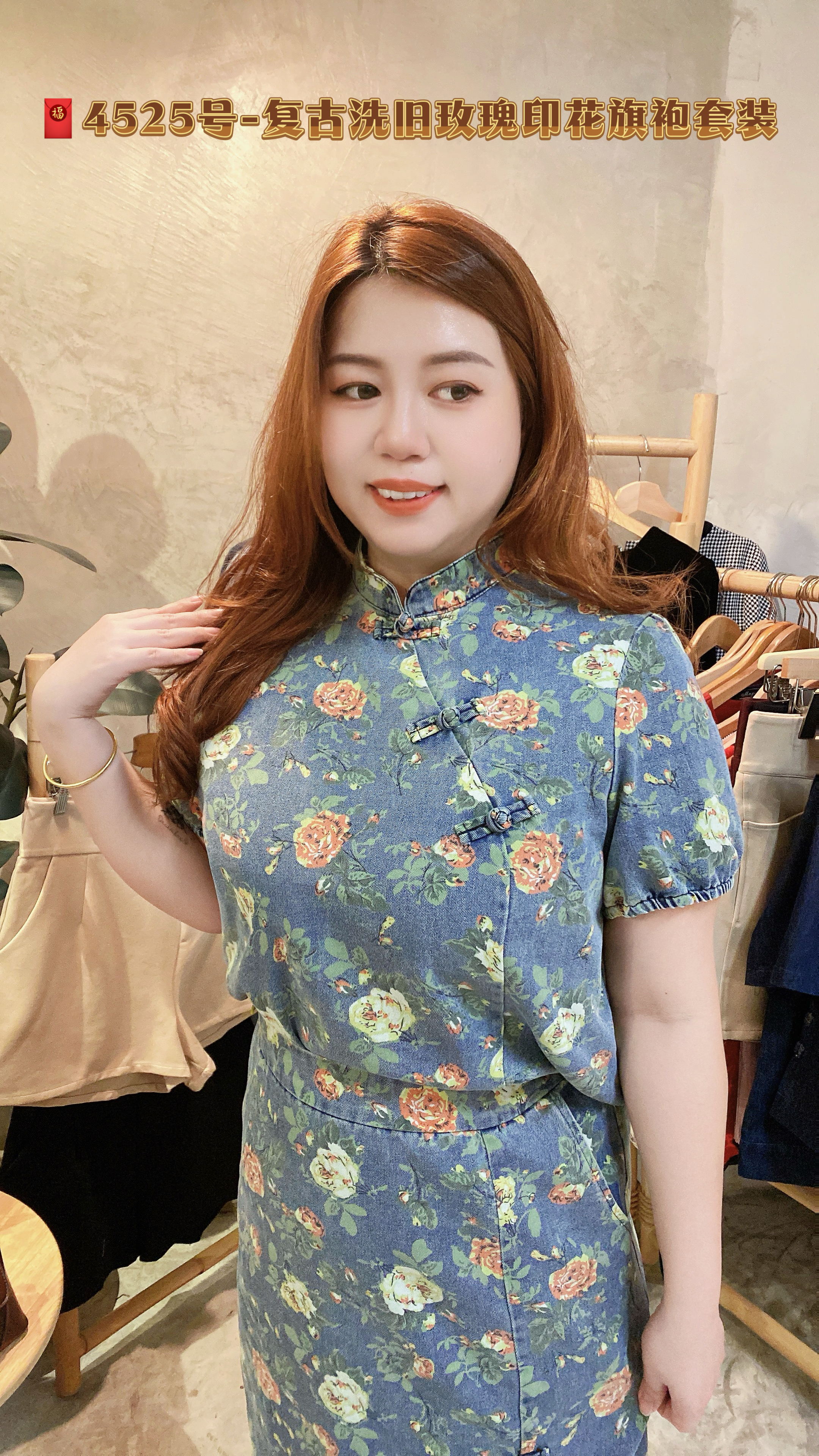 🧧4525号-复古洗旧玫瑰印花旗袍套装
